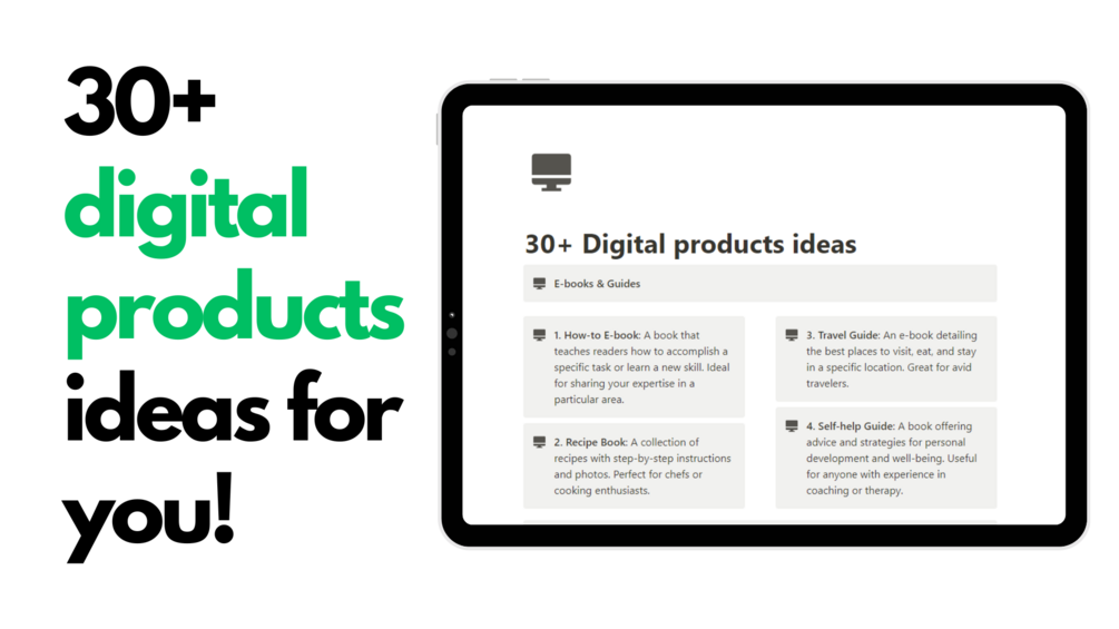 Are you ready to turn your passion into profit? Our guide to 30+ digital product ideas is here to help you create and sell your unique products online. Easy to understand and packed with practical tips, our guide is perfect for anyone – even a 10-year-old can follow along!